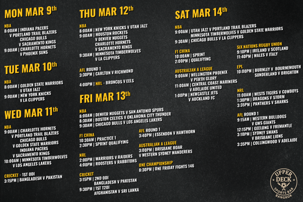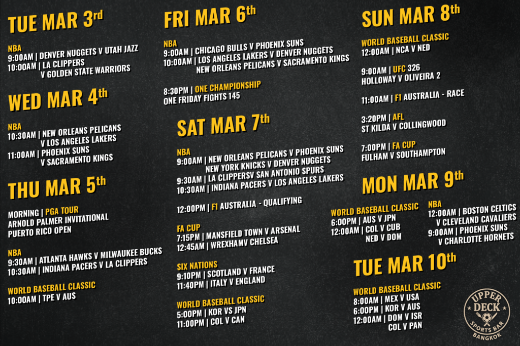 The transition from February to March is bringing absolute heat to the screens at Upper Deck. This week offers a perfect blend of high-octane motorsport, elite mixed martial arts, daily basketball, and some of the biggest matchups the Premier League has to offer. With cold beers on tap and our full international menu ready to go, there is no better place in Bangkok to catch all the action.
